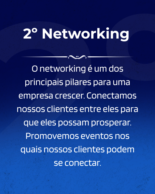 Acreditamos que conexões geram oportunidades, por isso incentivamos o networking entre empresários, criando um ambiente onde clientes podem trocar experiências, gerar parcerias e expandir seus negócios.